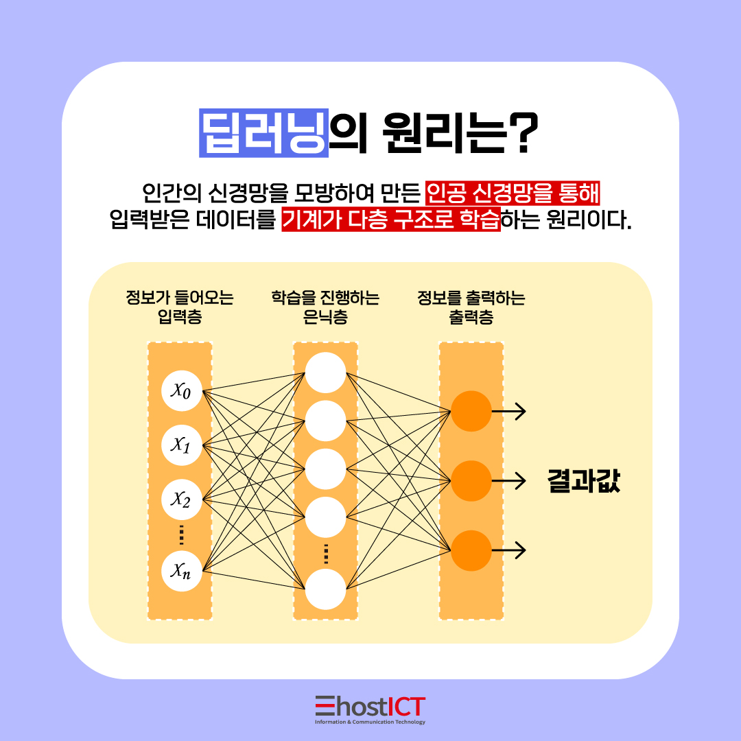딥러닝은 인공 신경망을 통해서 입력 받은 데이터를 기계가 다층 구조로 학습하는 원리로 작동합니다.
