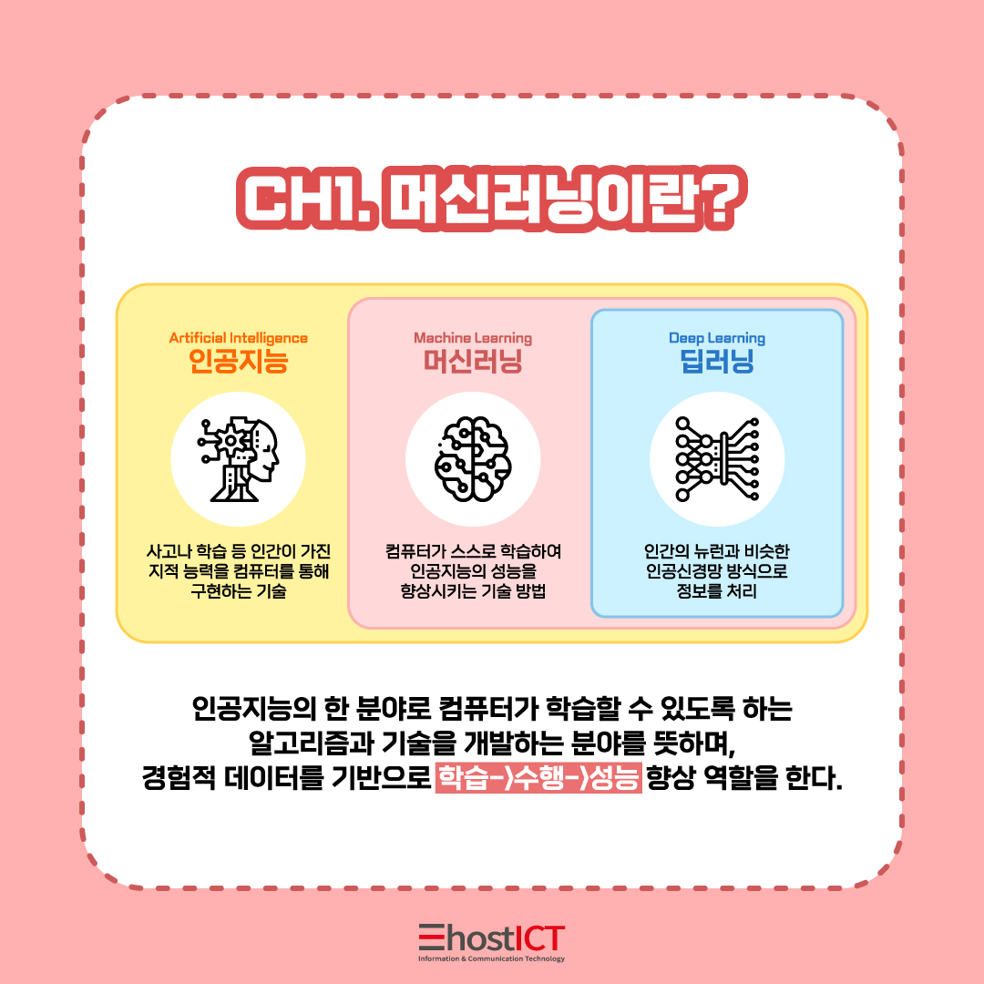 머신러닝은 인공지능의 하위 분야라고 보면 되는데요. 사람이 컴퓨터에게 다양한 정보를 가르쳐서 컴퓨터가 데이터를 분석하지 않고 스스로 학습하는 과정을 거치고 나면 입력하지 않은 정보에 대해서도 판단과 결정을 할 수 있게 되면서 인공지능의 성능을 향상시키는 기술 방법을 말합니다.