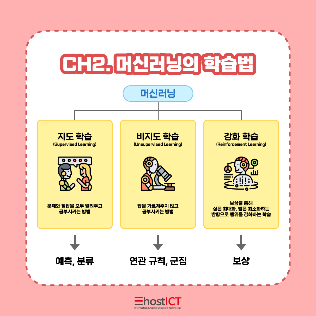 머신러닝의 학습 유형에는 지도 학습, 비지도 학습 그리고 강화 학습이 있습니다.