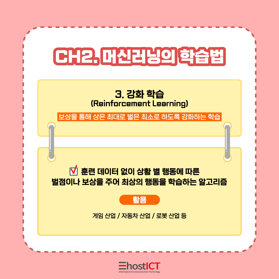 강화 학습을 이용한 머신러닝 적용 사례는 게임 산업, 자동차 산업, 로봇 산업과 같은 시행착오를 거쳐 보상을 극대화할 수 있는 행동을 찾아 선택하는 목적으로 주로 사용됩니다.