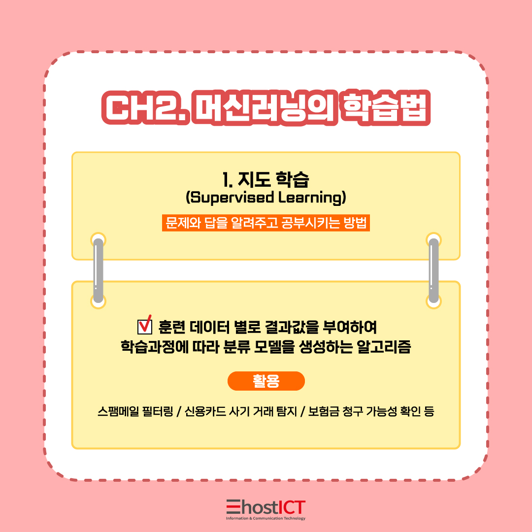 지도 학습을 이용한 머신러닝 적용 사례는 스팸메일 필터링, 신용카드 사기 거래 탐지, 보험금 청구 가능성 확인 등 지난 데이터를 기반으로 추후의 결과를 예측하는 데 주로 사용되는 알고리즘입니다.