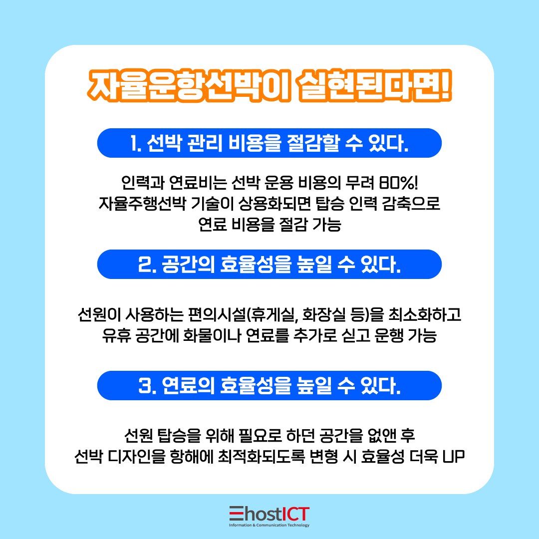 - 인력과 연료비는 선박 운용 비용의 무려 80%를 차지합니다. 그러나 자율운항 선박이 실현된다면 탑승 인력이 급격하게 감축되기 때문에 연료 비용을 절감할 수 있게 됩니다.