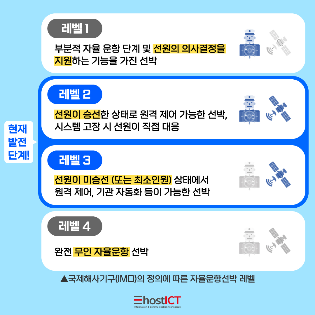이렇게 총 4레벨로 나뉘게 되는데 이는 국제해사기구(IMO)의 정의에 따른 자율운항 선박 레벨입니다.