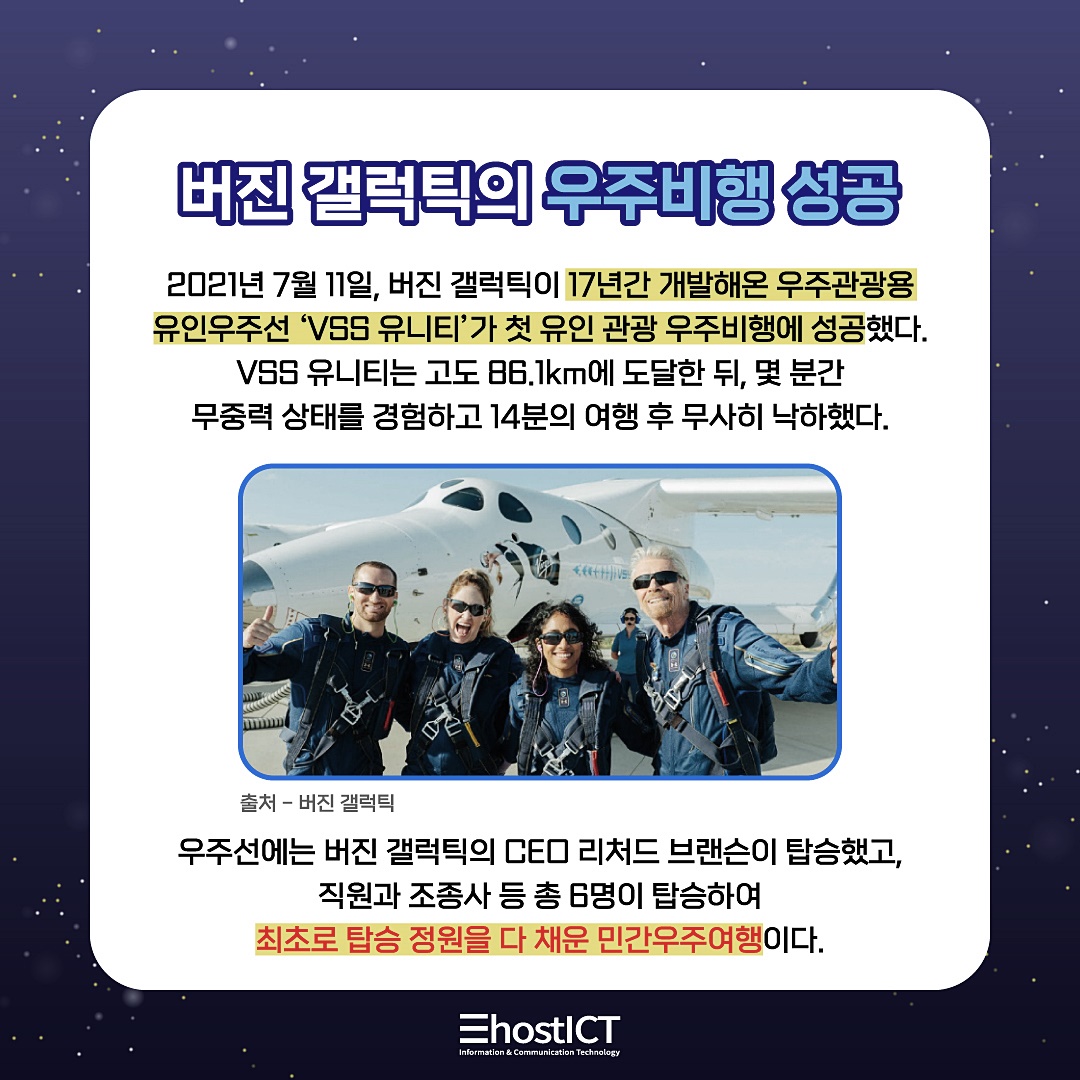 버진갤럭틱의 유인 우주선 비행 성공으로, 본격적인 민간 우주여행 시대가 개막될 것으로 예상됩니다. 버진 갤럭틱의 CEO리처드 브랜슨은 탑승객에 색다른 우주 경험을 제공하겠다고 밝혔으며, 2022년부터는 우주여행 상품을 본격적으로 서비스할 예정이라고 합니다.