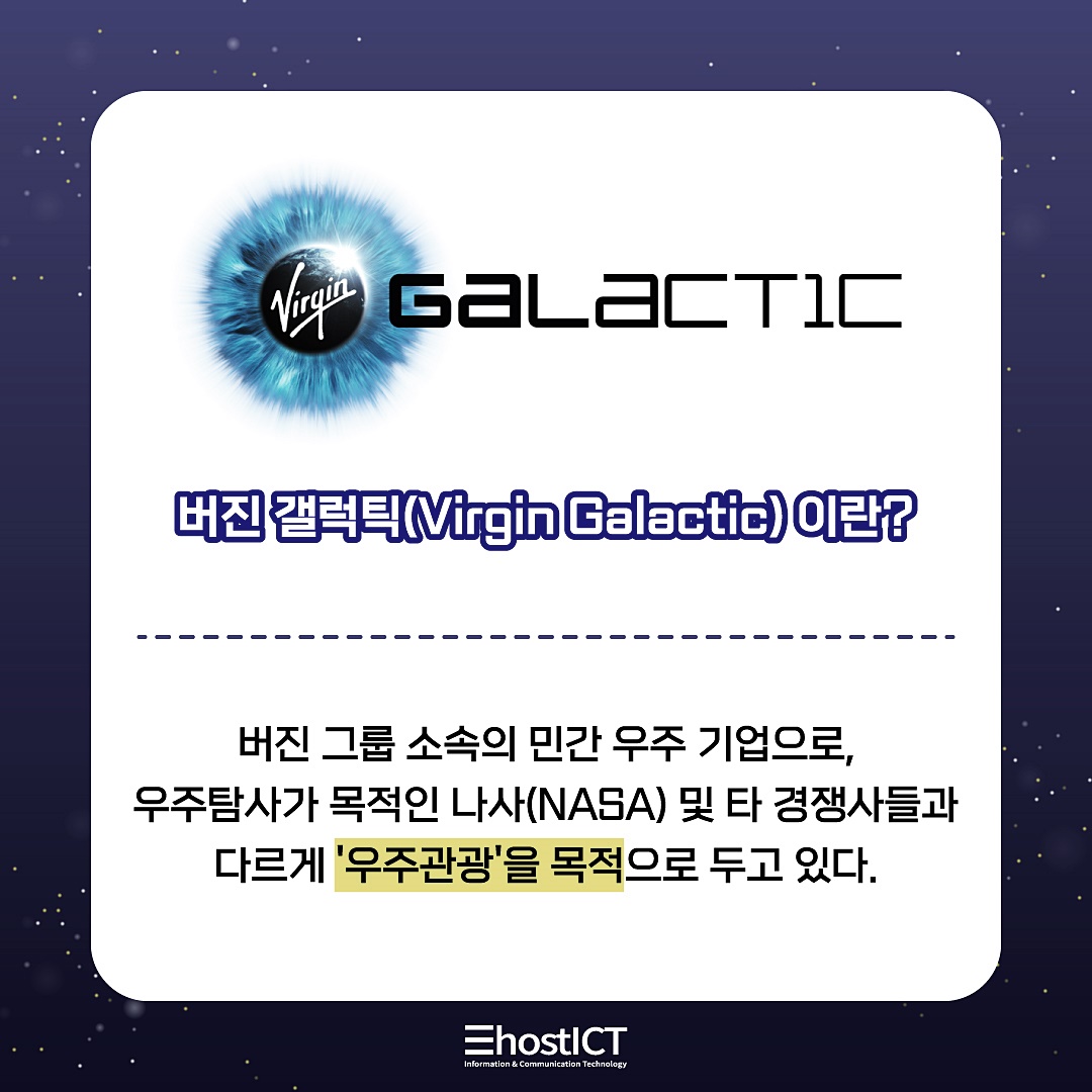 버진갤럭틱은 버진 그룹 소속으로, 창업주 리처드 브랜슨이 2004년 미국 캘리포니아에 설립하였습니다. 버진갤럭틱에서는 민간 우주 관광 사업을 목표로 하고 있습니다. 우주 탐사가 목적인 나사(NASA), 타 경쟁사와는 차별화된 부분입니다.