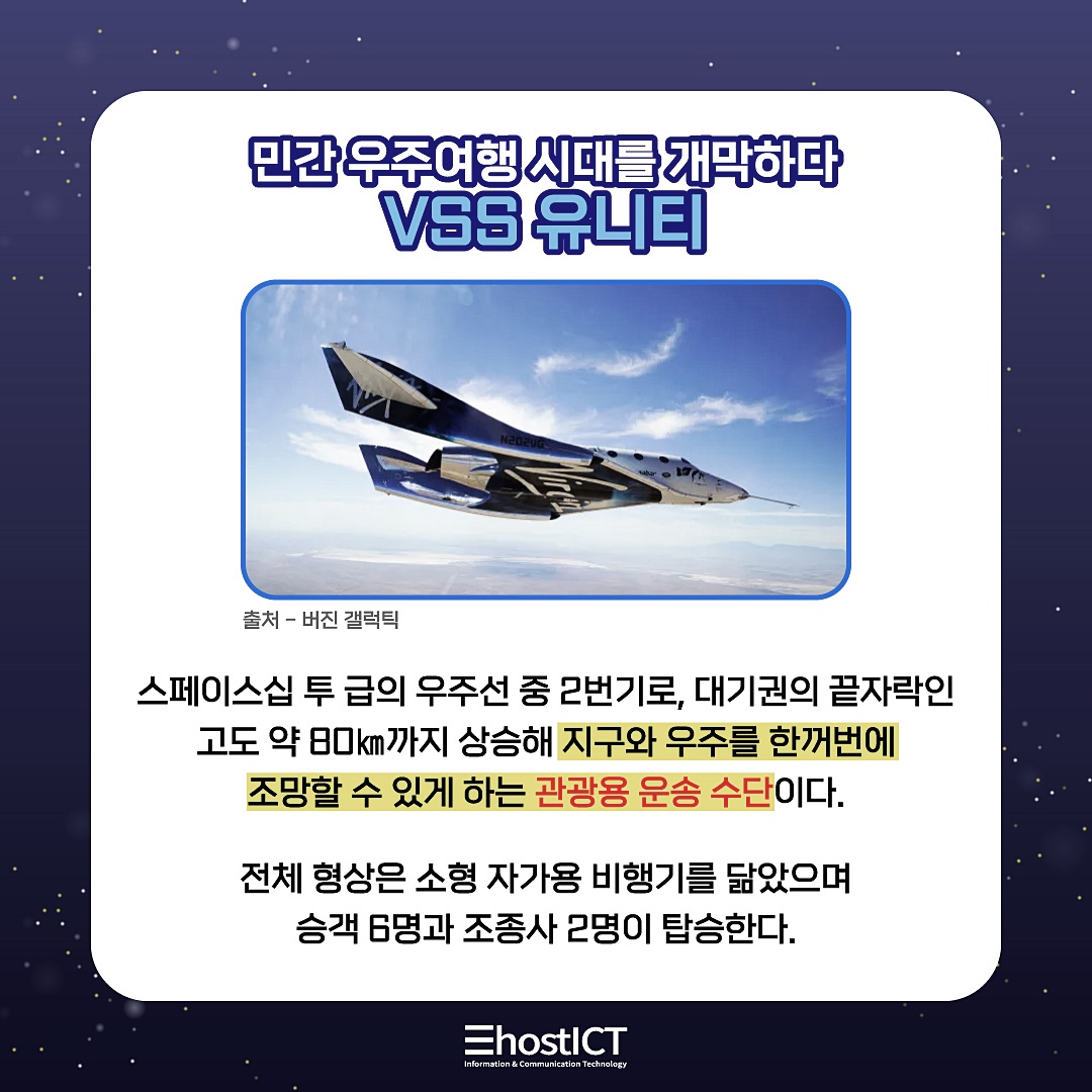 VSS유니티는 스페이스십 투 급의 우주선 중 2번기로, 대기권의 끝자락인 고도 약 80km까지 상승 후 지구와 우주를 조망할 수 있게 해주는 관광용 운송 수단입니다. 전체 형상은 소형 자가용 비행기와 닮아있으며, 조종사 2명과 승객 6명이 탑승할 수 있다고 합니다.