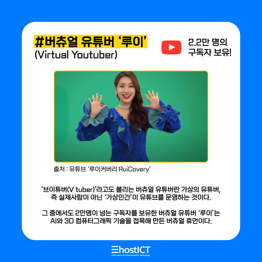 첫 번째로 소개드릴 버츄얼 휴먼은 버츄얼 유튜버 '루이'입니다. 루이는 '브이튜버(V tuber)'라고 불리는 가상의 유튜버인데요. 2만 명이 넘는 구독자를 보유한 버츄얼 유튜버 루이는 AI와 3D 컴퓨터그래픽 기술을 접목해 만든 버츄얼 휴먼입니다. 몸과 머리카락은 실제 사람이나, 얼굴은 7명의 얼굴 데이터를 기반으로 AI 기술을 통해 만들어졌다고 하는데요.