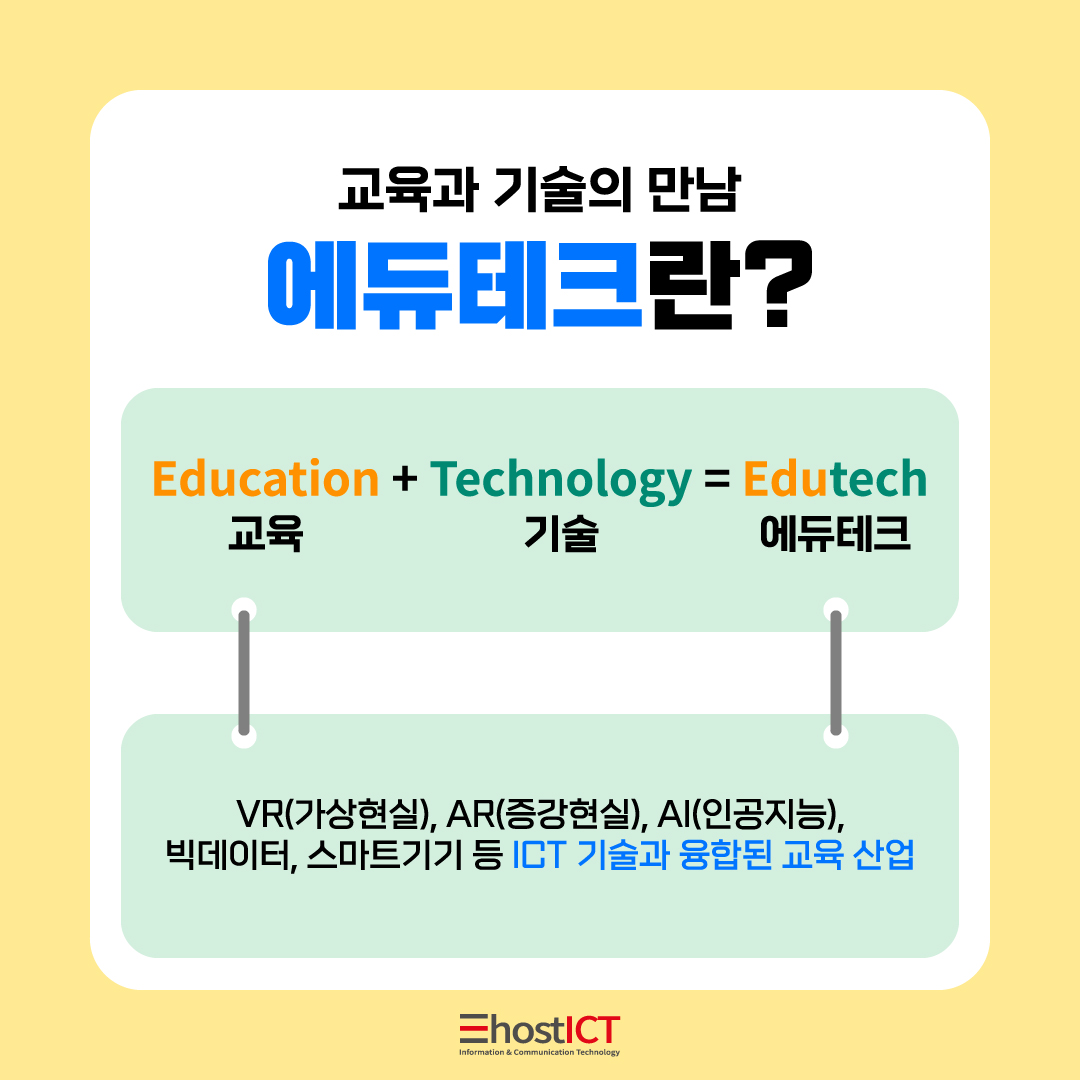 이는 에듀테크는 VR(가상현실), AR(증강현실), AI(인공지능), 빅데이터 스마트기기 등 ICT 기술과 교육이 융합된 산업으로, 에드테크(Ed-Tech)라고 불리기도 합니다.