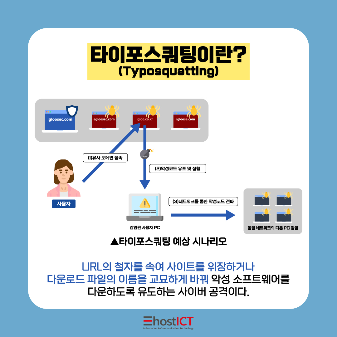 '타이포스쿼팅'은 URL의 철자를 속여 사이트를 위장하거나, 다운로드 파일의 이름을 교묘하게 바꿔 악성 소프트웨어를 다운하도록 유도하는 사이버 공격입니다.