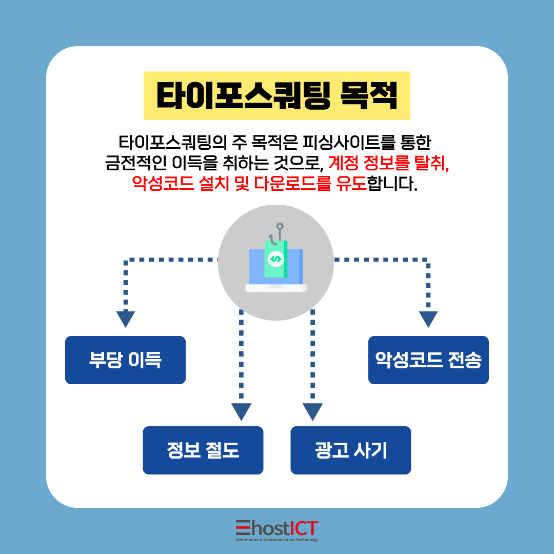 타이포스쿼팅의 주 목적은 피싱사이트를 통해 금전적인 이득을 취하는 것으로 계정 정보 탈취, 악성코드 설치 및 다운로드를 유도하는 것입니다. 타이포스쿼팅을 통해 악성코드를 전송하여 정보 절도, 광고 사기와 같은 부당 이득을 취하기 위함인데요.