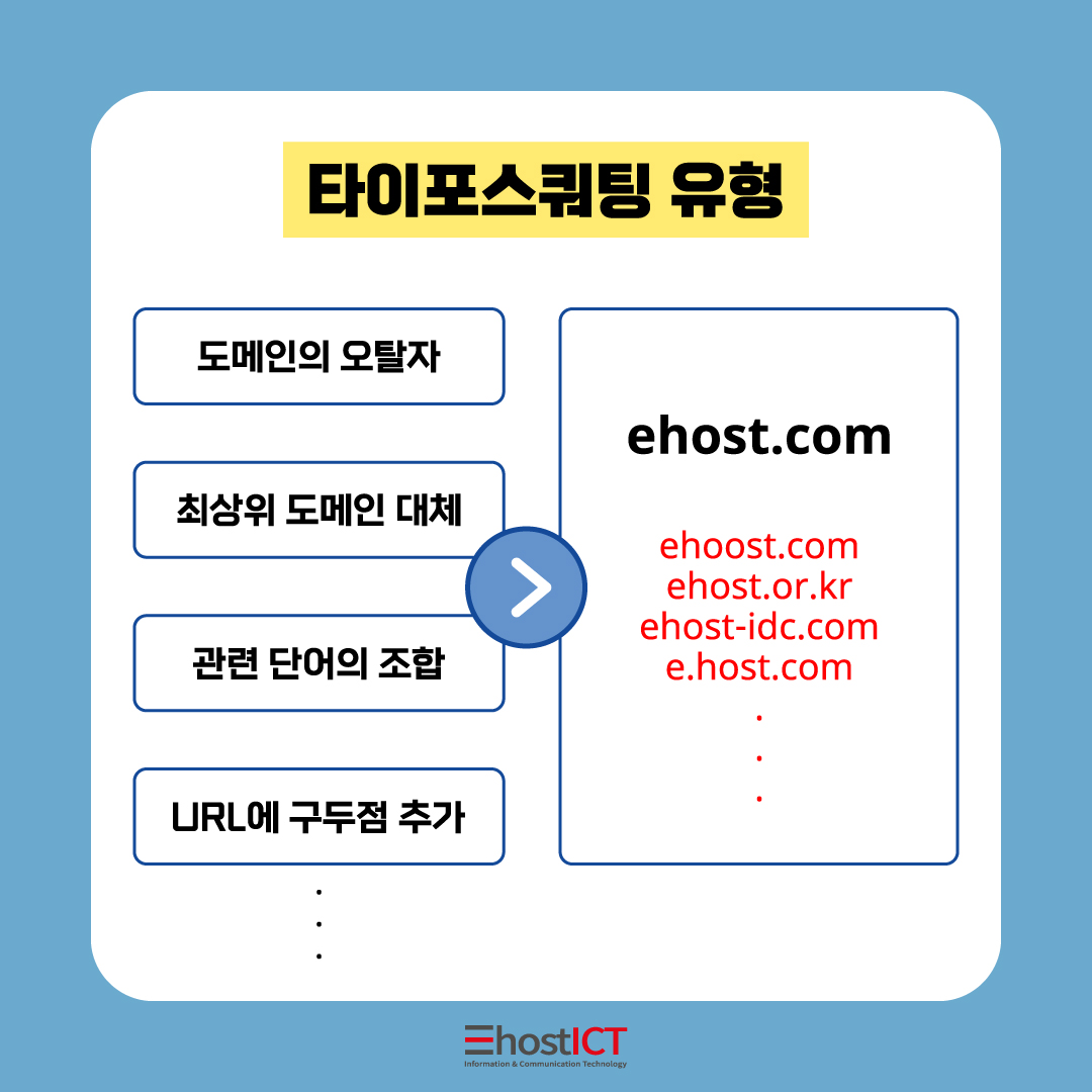 도메인이란, 인터넷상에서 개인이 소유하고 있는 인터넷 주소를 말하는데요. 예를 들어, ehost.com 이라는 정상적인 도메인이 있다면 ehoost.com, ehostt.com 과 같이 도메인의 오탈자를 넣어 유사 도메인을 생성하는 방식이 있습니다.
