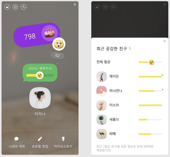 특히 공감 스티커와 조용히 나가기 기능은 이용자들의 높은 호응을 받았다. 공감 스티커는 인스타그램의 좋아요와 비슷한 성격을 띄고 있다. 다양한 감정을 표현할 수 있는 캐릭터가 적용된 스티커를 프로필 내에 자유롭게 배치 할 수 있다. 친구들은 스티커를 눌러 공감을 보낼 수 있다. 조용히 나가기는 단체 카카오톡 대화방 ‘팀 채팅방’에서 팀원들에게 알리지 않고 나가지는 기능이다.