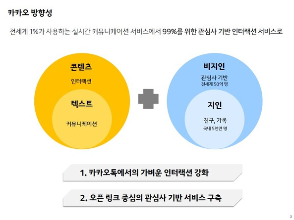 앞서 남궁훈 카카오 전 대표는 카카오톡의 체질개선을 예고한 바 있다. 국내 중심의 지인 기반의 모델은 한계가 있다고 본 것이다. 이에 관계성 기반에서 관심사 기반으로 확장해 글로벌에 진출하겠다는 포부를 보였다.