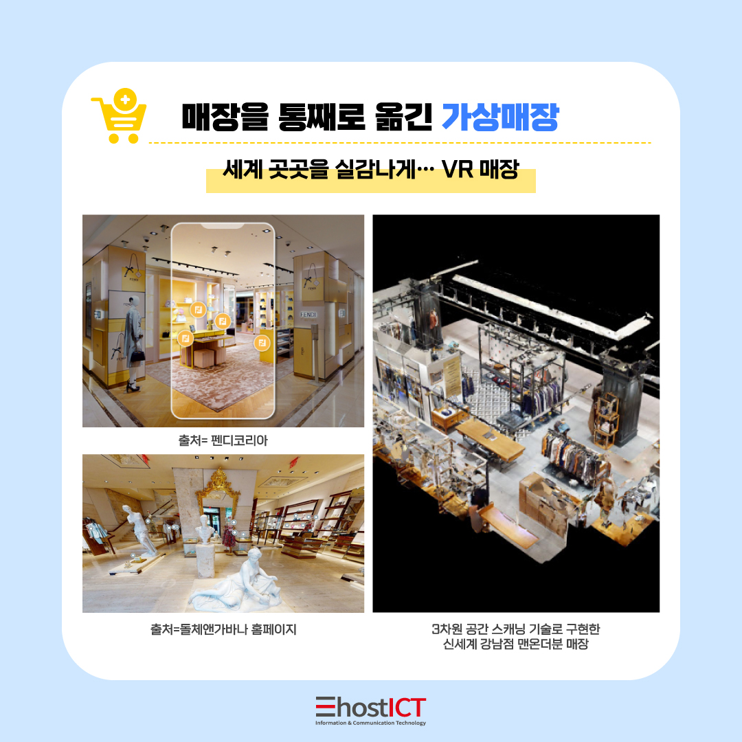 코로나 팬데믹으로 인해 해외는 물론 국내 쇼핑을 다녀오기조차 쉽지 않지요?쇼핑에 목마른 우리에게 "세계의 매장을 통째로 옮긴" 가상매장이 화제입니다.세계 곳곳을 실감나게 표현한 VR 매장의 사례로는 펜디코리아, 돌체엔가바나, 구찌 등 명품 하이엔드 브랜드가 앞장서고 있습니다. 프랑스 파리에서 실감나게 쇼핑을 즐기듯 VR과 AR 기술을 활용한 생생한 경험을 제공하고 있는 VR 매장은 앱 또는 홈페이지를 통해 간단하게 방문할 수 있어 간편하고 다채로운 브랜드 경험을 제공하고 있습니다.