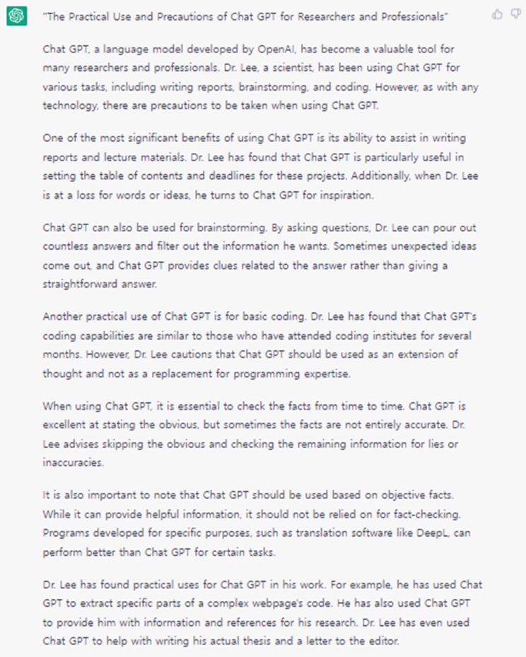 본지는 이제현 한국에너지기술연구원 박사가 말하는 챗GPT의 활용법, 활용사례, 주의사항 등을 취재했습니다. 이 내용을 기반으로 기사 작업은 챗GPT에게 맡겼습니다. 챗GPT는 제목과 함께 서론, 본론, 결론 등 대체적으로 완벽한 기승전결의 글을 구사했습니다(보다 정확한 사용을 위해 영어로 진행했습니다).