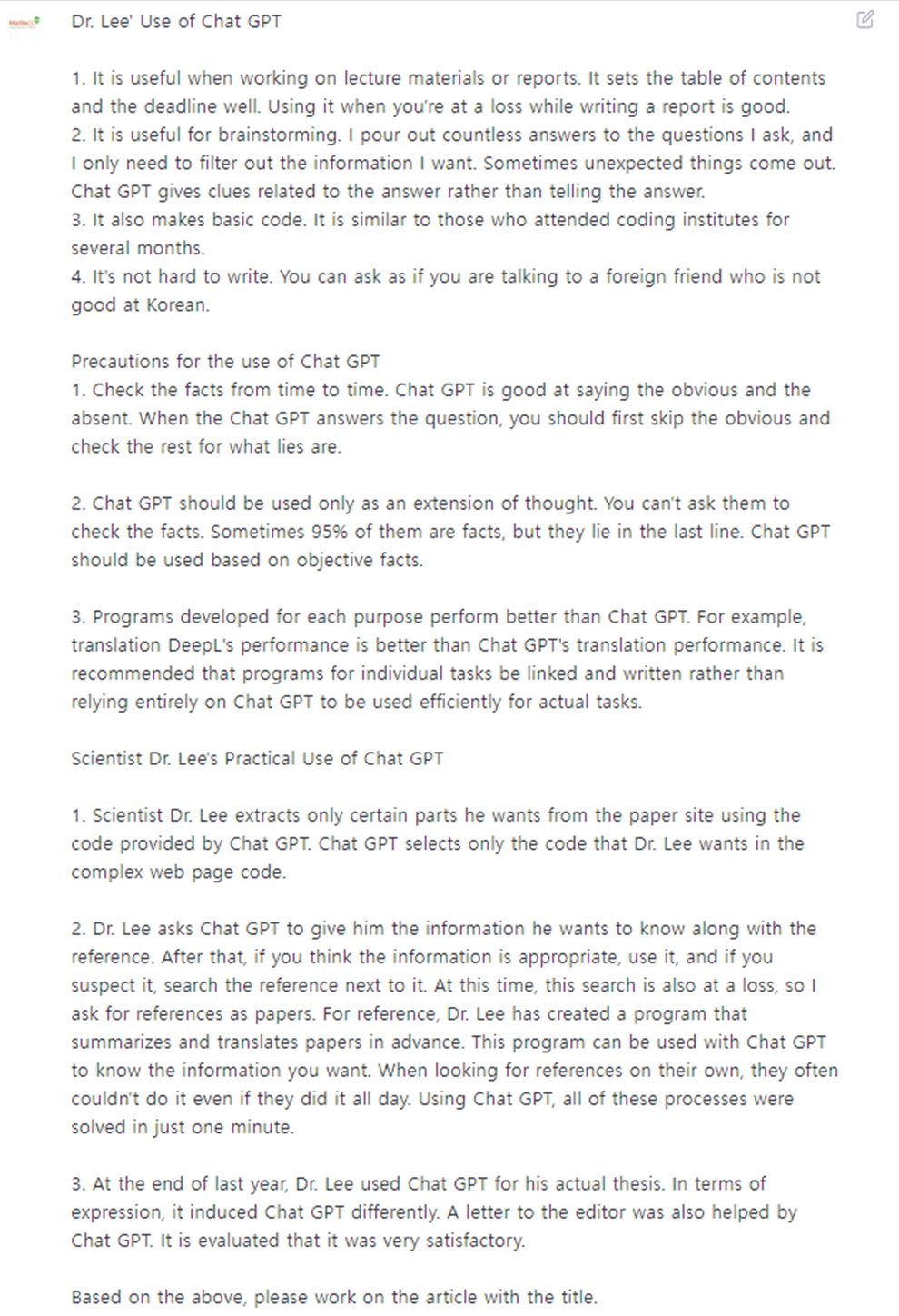 3. 지난해 말 이 박사는 실제 논문 투고에 챗GPT를 활용했다. 표현 등에 있어 챗GPT에게 다른 방식을 유도해 낸 것이다. 또 편집자에게 보내는 편지 또한 챗GPT의 도움을 받았다. 굉장히 만족스러웠다는 평가다.