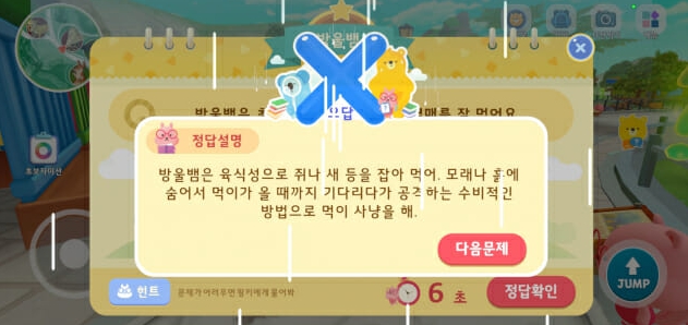 동물과 공룡 앞을 지날 때 '핑키'라는 캐릭터가 퀴즈를 풀어보라고 한다. 해당 동물, 공룡에 관한 O, X형 문제 몇 가지를 풀면 아이템을 살 수 있는 포인트가 또 생겼다.