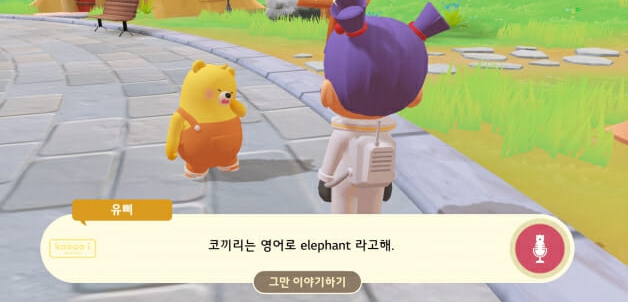 유삐는 감성 대화를 할 수 있는 AI 곰돌이 캐릭터다. 유삐에게 같은 질문을 하니 "코끼리는 영어로 elephant라고해"로 답했다.
