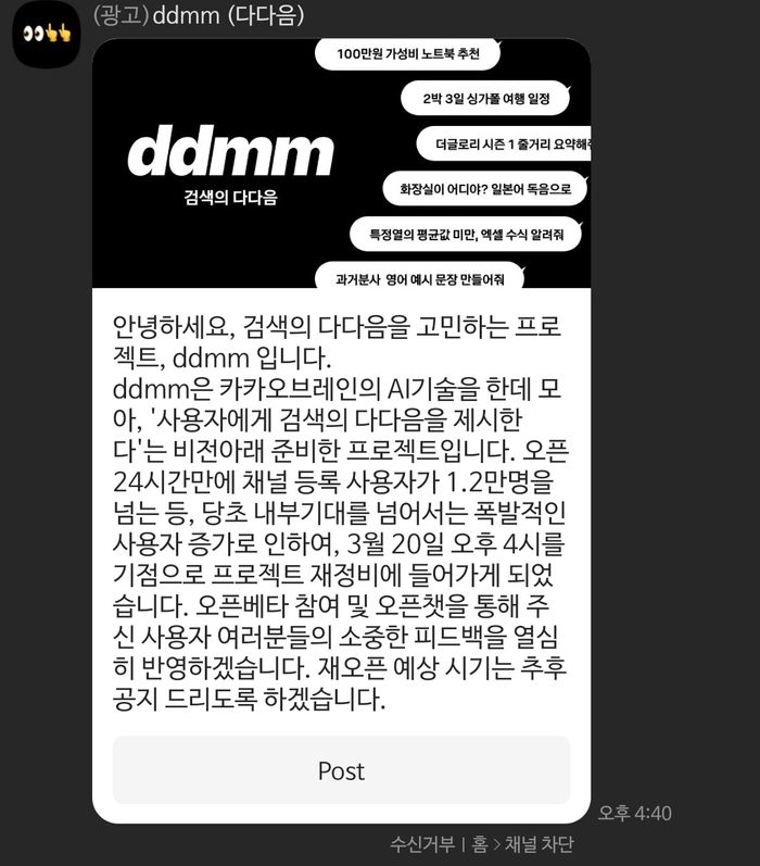 카카오브레인 측은 "사용자의 피드백을 열심히 반영해 빠른 시일 내에 더 발전된 모습으로 다시 돌아오겠다"며 "ddmm에 보내주신 성원에 깊이 감사드린다"고 말했다.