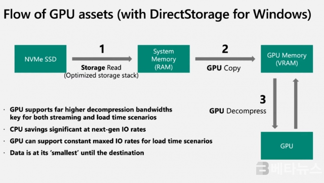 또한 M.2 NVMe SSD는 윈도우 10과 윈도우 11 환경에서 ‘다이렉트스토리지’(DirectStorage)라는 특별한 기술도 쓸 수 있다. 기존 SATA3 SSD보다 데이터 입출력 과정을 간소화시켜서 게임을 비롯한 소프트웨어 로딩 시간을 몇 배 이상 단축시키는 것이 특징이다.