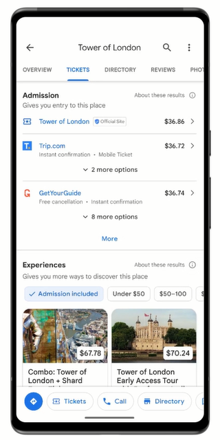 런던 타워와 같은 명소의 경우, 여러 정류장이 포함된 도시 전체 투어와 같은 관련 경험에 대한 제안도 찾을 수 있다.
