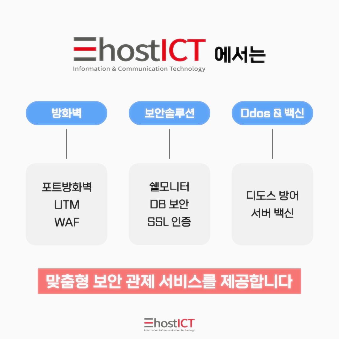 AI, IoT의 발달로 스마트 홈 시스템은 우리에게 편리함을 제공하고 있지만, 보안 관제에 대한 방심은 금물입니다. 당사 이호스트ICT에서는 방화벽과 보안 솔루션, Ddos&백신 등의 맞춤형 보안 관제 서비스를 전문적으로 제공하고 있습니다. 빠르고 유용한 서비스는 물론, 늘 안전한 토탈 IT 서비스를 약속 드리겠습니다.