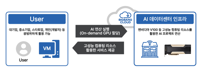 빅뱅 클라우드는 그래픽 처리 장치(GPU)를 포함하는 고성능 컴퓨팅 리소스에 대한 가상 액세스를 제공하는 서비스다. 고가의 GPU 인프라를 실 사용량 기반 종량제로 대여하여 인공지능(AI) 워크로드에 활용할 수 있는 서비스인 빅뱅 클라우드는 GPU 연산 실행이 이뤄지는 시점에 대해서만 On-demand GPU가 할당되어 과금되는 구조로, AI 개발 비용 및 인프라 구축 비용을 절감할 수 있는 방법이다.