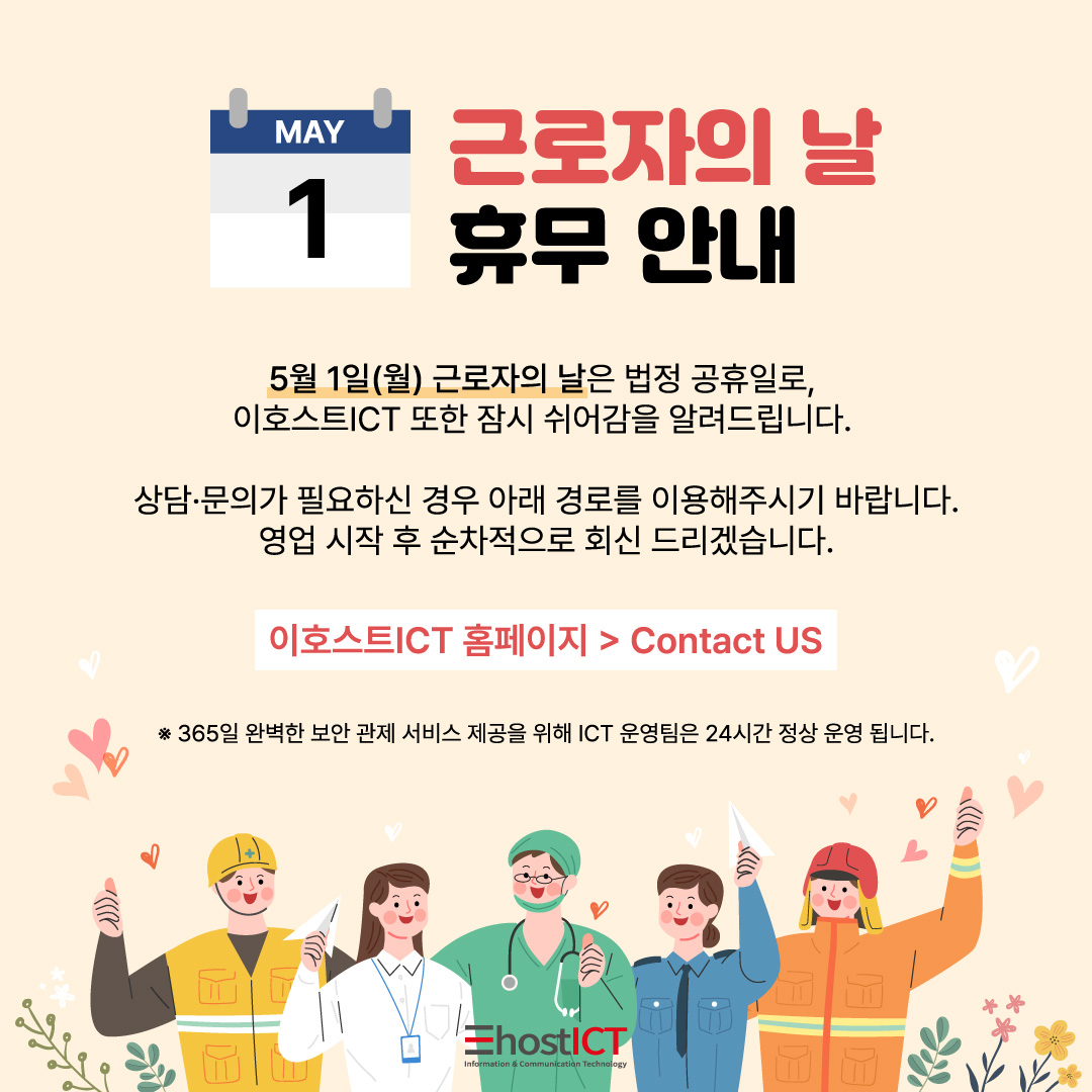 2023년 5월 1일(월) 근로자의 날은 법정 공휴일로, 이호스트ICT 또한 잠시 쉬어감을 알려드립니다.