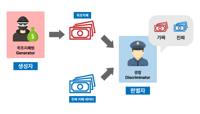 이 모델의 제안자인 이안 굿펠로(Ian Goodfellow)는 논문에서 GAN의 원리를 경찰과 위조지폐범이라고 예를 들어 설명했는데요. 생성자가 위조지폐범, 판별자를 경찰이라고 대입하였습니다. 위조지폐범이 위조지폐를 생성하면 경찰은 이 지폐의 진위 여부를 판별하여 범인을 검거해야 하는 것이죠. 이 과정이 반복되면 위조지폐범은 경찰을 속이지 못한 데이터를, 경찰은 위조지폐범에게 속은 데이터를 입력받아 적대적으로 학습하게 됩니다. 그 결과로 두 요소 모두 각자의 능력이 향상되고 결국 위조지폐범은 시간이 지날수록 진짜 지폐와 유사한 위조지폐를 만들게 되어 경찰이 구별할 수 없을 때까지 진행이 되는 것입니다. 즉, 이 과정이 반복되면서 위조지폐가 정교해지듯 점점 더 실제에 가까운 거짓 데이터를 생성하게 되는 것이죠.