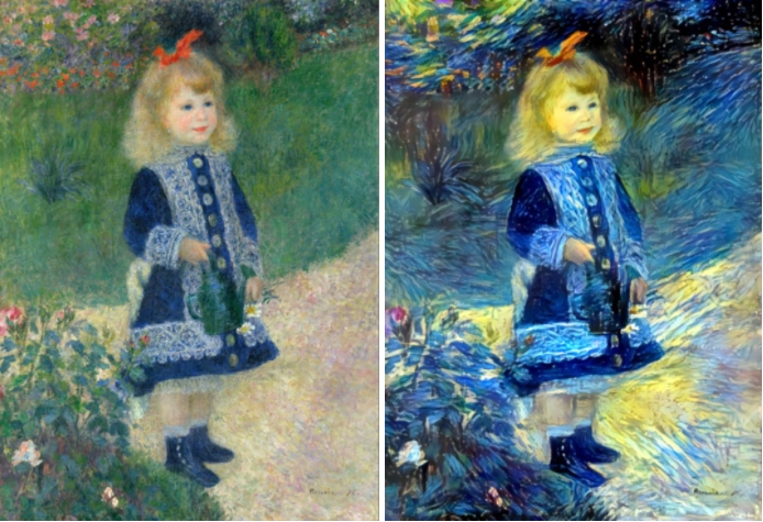 모든 작품에는 스타일이 있고, 그 스타일 속에는 규칙이 존재하는데요. 이 특정 스타일의 규칙을 학습하여 다른 이미지들에 적용이 가능합니다. 같은 맥락으로 특정 작가의 화풍을 지속적으로 학습한다면 특정 작가의 화풍을 그대로 적용하여 새로운 이미지로 탄생시킬 수 있는데요. 구글이 만든 '딥드림'은 입력되는 이미지 요소를 잘게 나눠 데이터화한 후 새로 입력된 이미지에 학습한 이미지 패턴을 적용시키는 GAN 프로그램입니다.