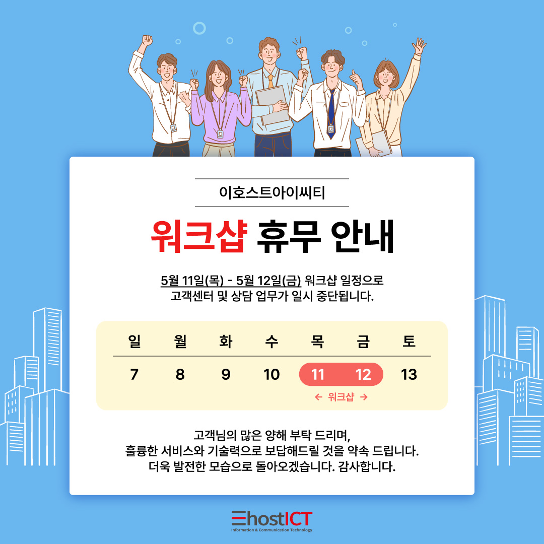 5월 11일(목) - 5월 12일(금)은 워크샵 일정으로 고객 센터 및 상담 업무가 일시 중단됩니다.