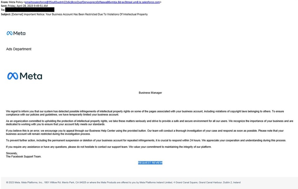 메일 본문에는 메타의 공식 로고와 함께 "사용자의 비즈니스 계정 일부 페이지에서 지적재산권 침해 가능성을 감지해 해당 계정을 차단했다. (계정 차단이) 오류라고 생각한다면 아래 버튼(REQUEST REVIEW)을 눌러 이의를 제기하라"는 내용을 적었고, 피싱 웹사이트로 연결되는 URL이 포함된 버튼의 클릭을 유도했다.