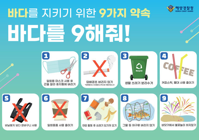 1. 일회용 마스크 사용 후 끈을 잘라 휴지통에 버리기 2. 담배꽁초 버리지 않기 3. 생활 쓰레기 분리수거 4. 커피 스틱, 빨대 사용 줄이기 5. 비닐봉지보다 장바구니 사용 6. 일회용품 사용 줄이기 7. 야외 활동 후 쓰레기 되가져 오기 8. 그물 등 어구류 버리지 않기 9. 바닷가에서 불꽃놀이하지 않기 |