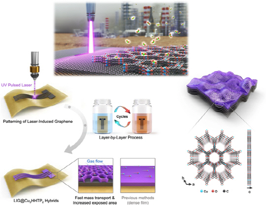 연구팀은 레이저유도그래핀(LIG)의 하부구조에 1g만으로도 축구장 만큼의 표면적을 가질 만큼 극도로 높은 나노-다공성을 갖는 금속유기구조체(MOF)를 선택적으로 성장시킨 하이브리드 구조를 제작해 실시간으로 초저농도 이산화질소 모니터링이 가능한 센서를 개발했다. 이 센서는 사람의 폐를 닮은 계층적 기공구조를 가져 표면적뿐 아니라 빠른 기체 교환에서도 우수한 성능을 확보했다. 실제로 기존 이산화질소 센서와 비교했을 때 가장 낮은 수준의 검출한계(0.168ppb)와 가장 빠른 반응 시간(15초)을 달성했다고 연구팀은 설명했다.