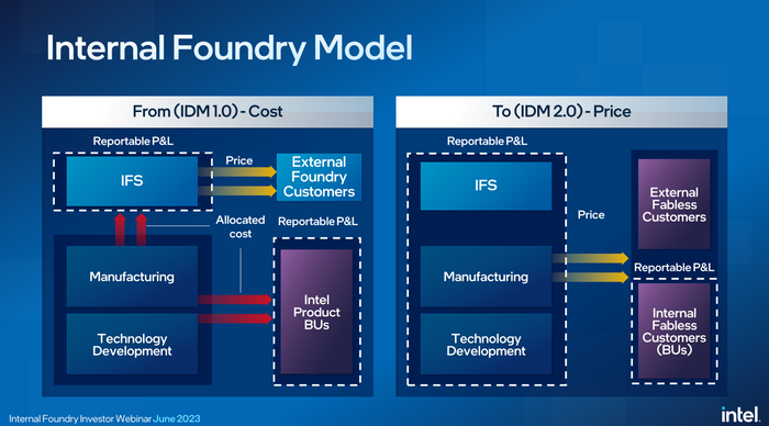 인텔은 2024년 1분기부터 제조·기술 개발 사업부를 인텔파운드리서비스(IFS)와 합쳐, 독립적인 손익(P&L)을 집계·관리하는 것을 골자로 한 ‘내부 파운드리’ 전략을 22일 발표했다. 지금까지 CPU와 그래픽처리장치(GPU) 등 인텔 주력 제품 생산을 담당하는 제조·기술 개발 사업부 수익은 인텔 전체 매출에 포함됐다.