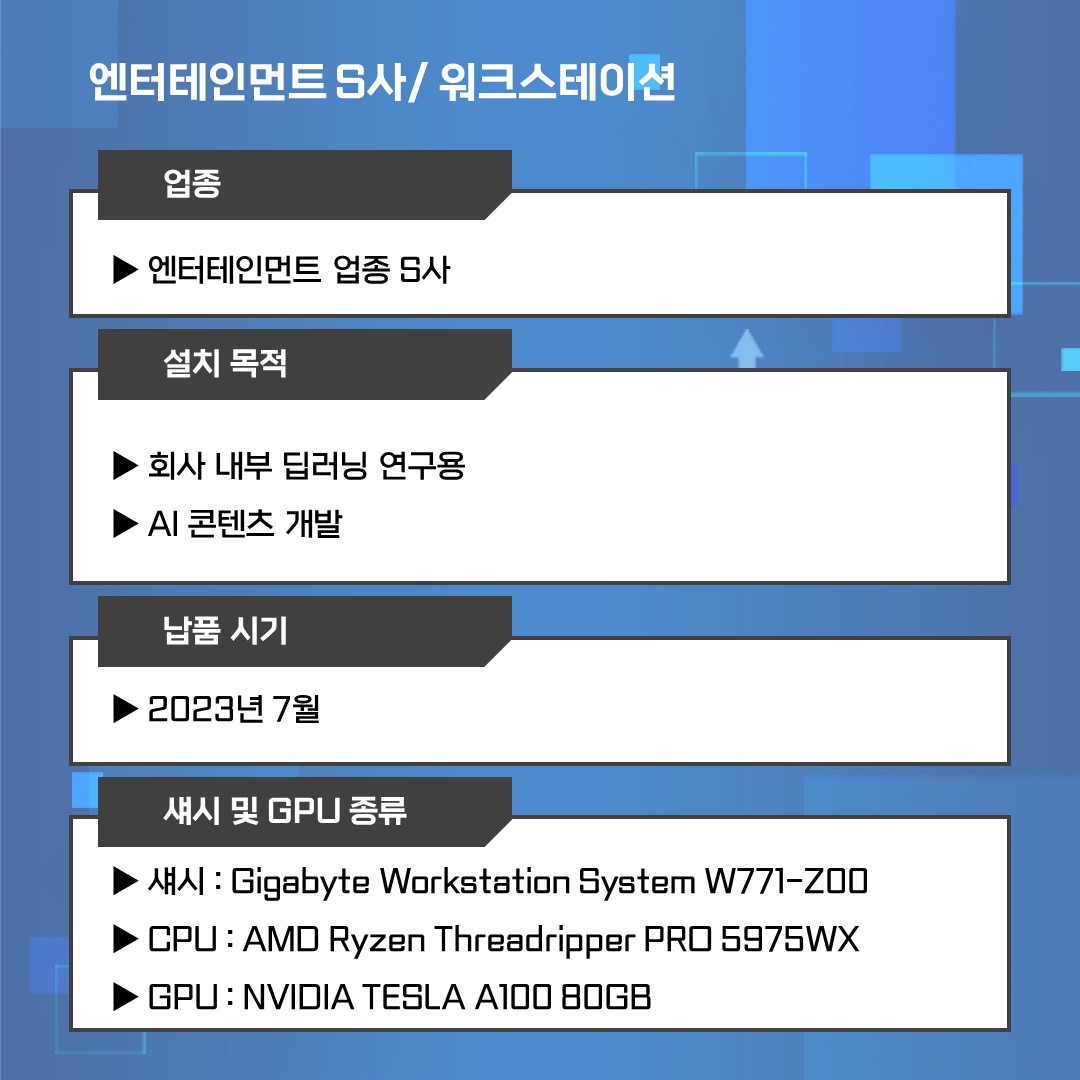 엔터테인먼트 업종 S사 / 회사 내부 AI 기술 개발(딥러닝 연구) 목적의 서버 납품 사례