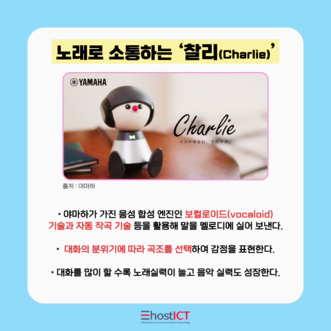 찰리는 야마하가 가진 음성 합성 엔진인 보컬로이드 기술과 자동 작곡 기술 등을 활용해 멜로디에 언어를 실어 보냅니다. 대화의 분위기에 따라 곡조를 선택하여 감정을 표현하기도 하는데요. 대화를 많이 나눌수록 노래 실력과 음악에 대한 작곡 실력도 향상된다고 합니다.