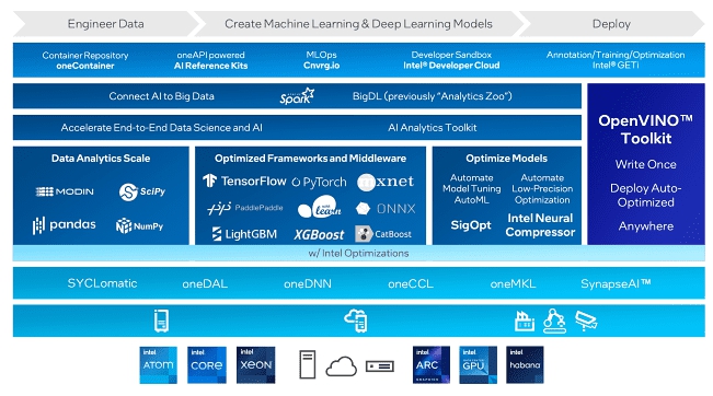 프레임워크 및 툴 계층은 데이터 분석의 MODIN, 판다스, SciPy, NumPy 등을 제공하고, 프레임워크와 미들웨어로 텐서플로우, 파이토치, MXNET, 패들패들, ONNX, XGBoost, CatBoost, LightGBM 등의 최적화 버전을 제공한다. 최적화 모델로 오토ML, 인텔뉴럴컴프레서, 오토메이트모델튜닝, 시그옵트 등을 제공한다. 그 위에 빅DL. 스파크 등의 플랫폼과 키트를 넣었다.