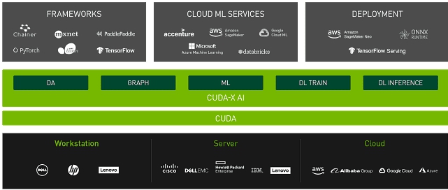 구글은 AI 개발 프레임워크인 ‘텐서플로우’ 첫 버전을 GPU 지원을 제외한 상태로 공개했다가 나중에 cuDNN 라이브러리를 채택해 GPU 가속을 활용할 수 있게 했다. 메타에서 내놓은 또 다른 AI 개발 프레임워크 ‘파이토치’도 cuDNN 라이브러리를 채택해 파이썬에서 GPU 기반 연산을 활용하게 했다. 주요 프레임워크가 cuDNN 라이브러리를 포함하면서, 개발자는 자신에게 익숙한 개발언어로 AI 모델을 만들 수 있게 됐다. DNN 라이브러리가 쿠다로 만들어졌고, 쿠다는 엔비디아 GPU만 사용할 수 있으니 자연스레 엔비디아가 기본 하드웨어로 자리잡았다.