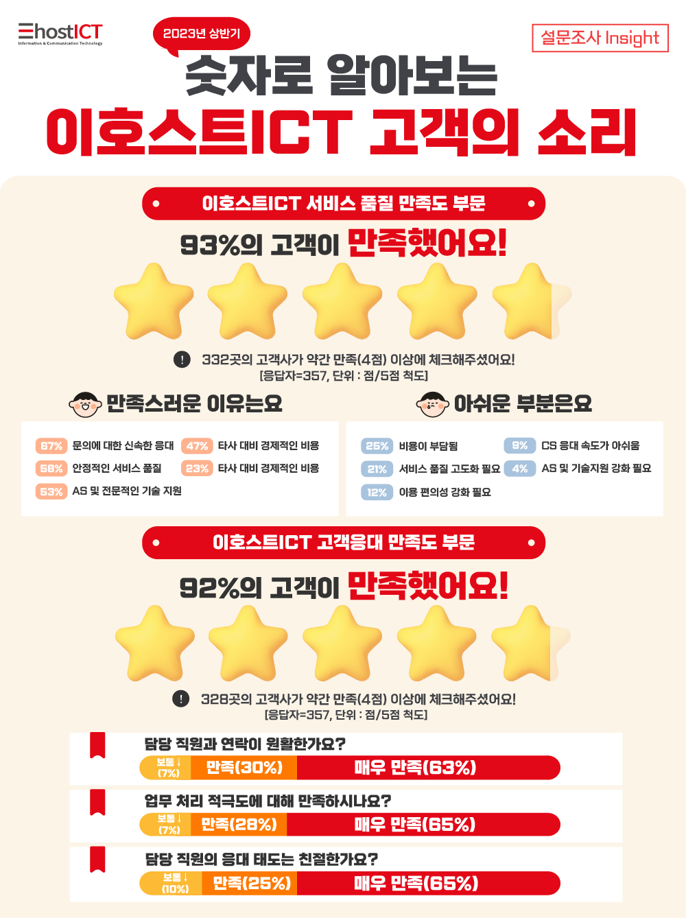 토탈 IT 솔루션 기업 이호스트ICT(대표 김철민)가 2023 상반기 고객만족도 결과를 바탕으로 각 부서별 개선 전략을 실행하는 등 고객중심 경영 강화에 나섰다.