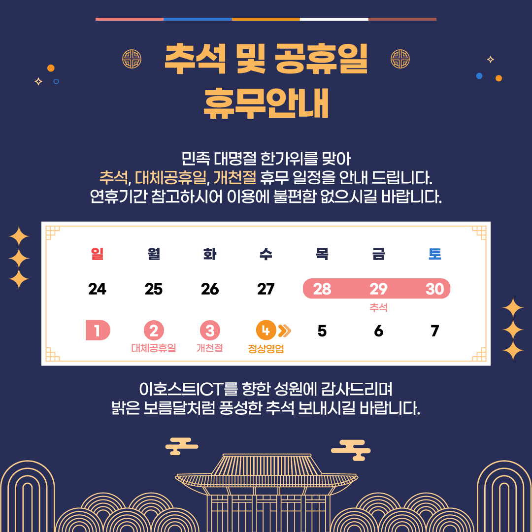 추석, 대체공휴일, 개천절 휴무 일정을 안내 드립니다