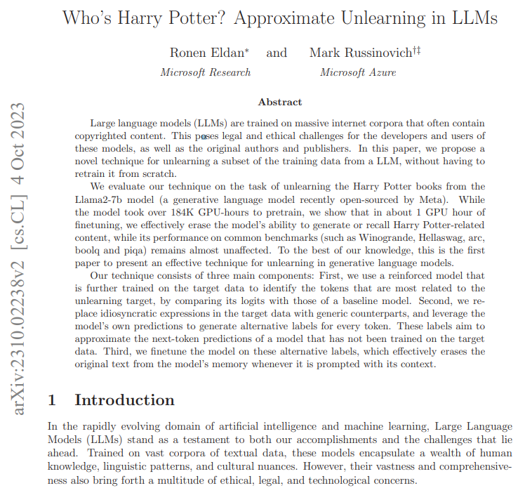 이에 따르면 로넨 엘던 MS 리서치 연구원 마크 러시노비치 MS 애저 연구원은 메타의 오픈 소스 LLM '라마 2 7B' 모델에 포함된 해리포터에 대한 모든 지식을 삭제하는 데 성공했다. 논문의 제목도 '해리 포터가 누구? 대략적인 LLM의 학습 취소법(Who’s Harry Potter? Approximate Unlearning in LLMs)'이다.