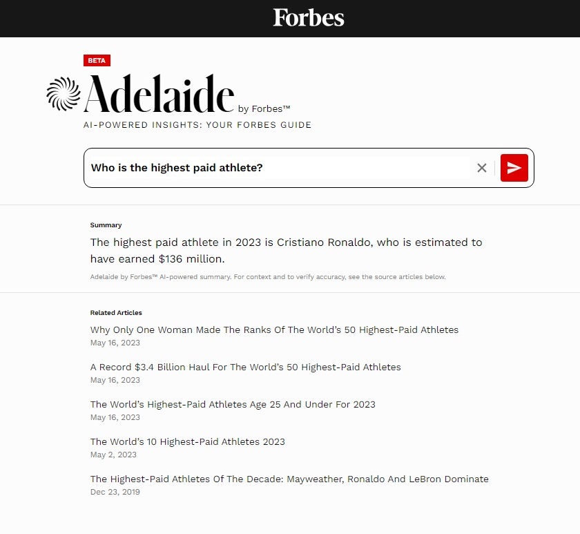 또한 검색 결과의 최신성을 유지하기 위해서 애들레이드는 포브스에서 1년 이내 발행한 기사 데이터만 참고한다. 이러한 애들레이드를 통해 포브스는 검색 및 대화 기반 접근 방식을 제공하고 독자들이 보다 쉽고 직관적으로 콘텐츠를 검색할 수 있을 것으로 기대하고 있다.