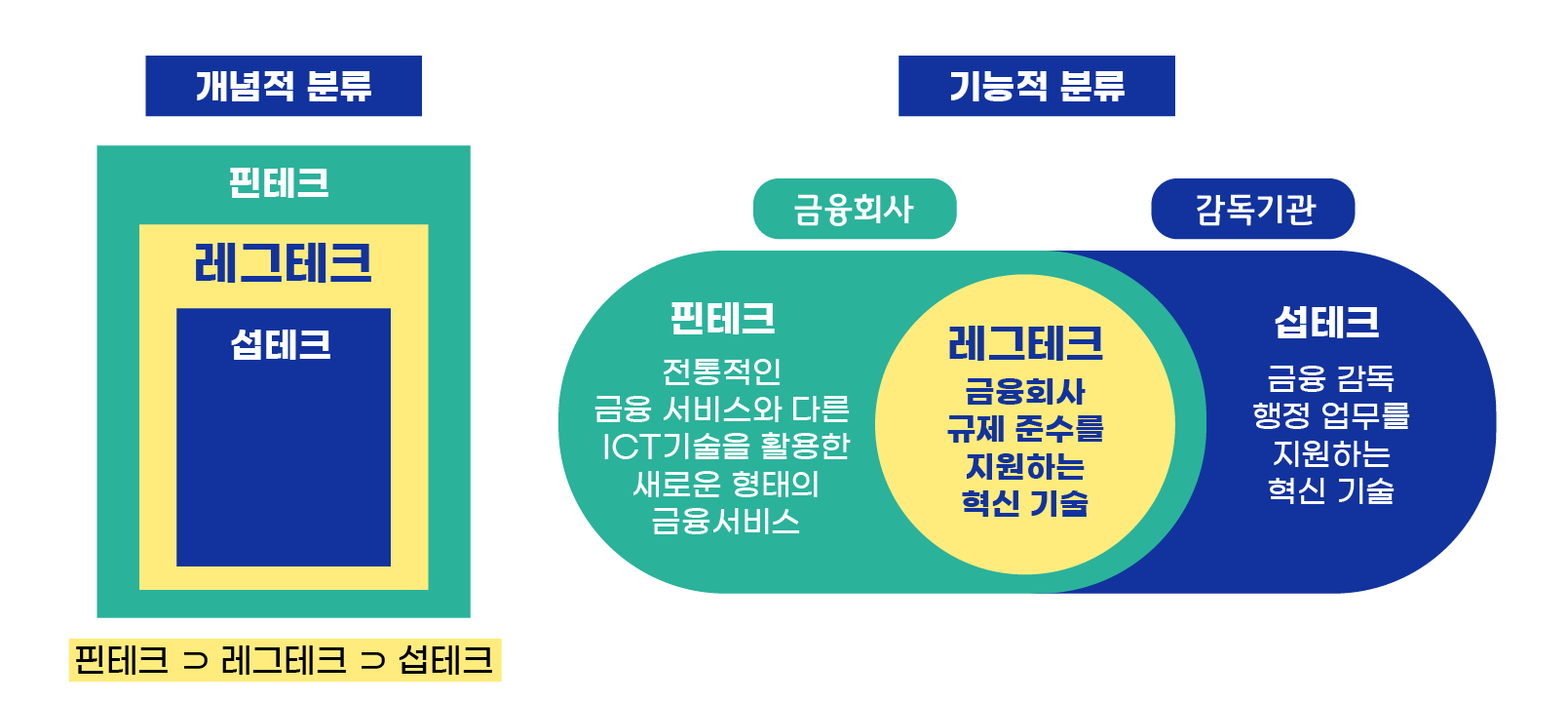 레그테크는 규제 기관의 규제 감독을 돕는 섭테크(Suptech)와 피규제 기관의 규제 준수를 돕는 컴프테크(Comptech)로 나뉘는데요.