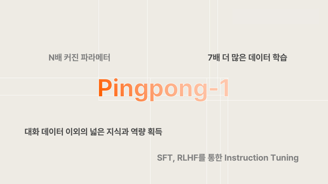 또 이날 배포한 사진 자료에 핑퐁-1에 대한 힌트를 남겼다. 여기에는 ▲대화 데이터 이외의 넓은 지식과 역량 ▲N배 커진 파라메터(매개변수) ▲7배 더 많은 데이터 학습 ▲SFT(선택적 미세조정), RLHF(인간 피드백 기반 강화학습) 등이 포함돼 있다.