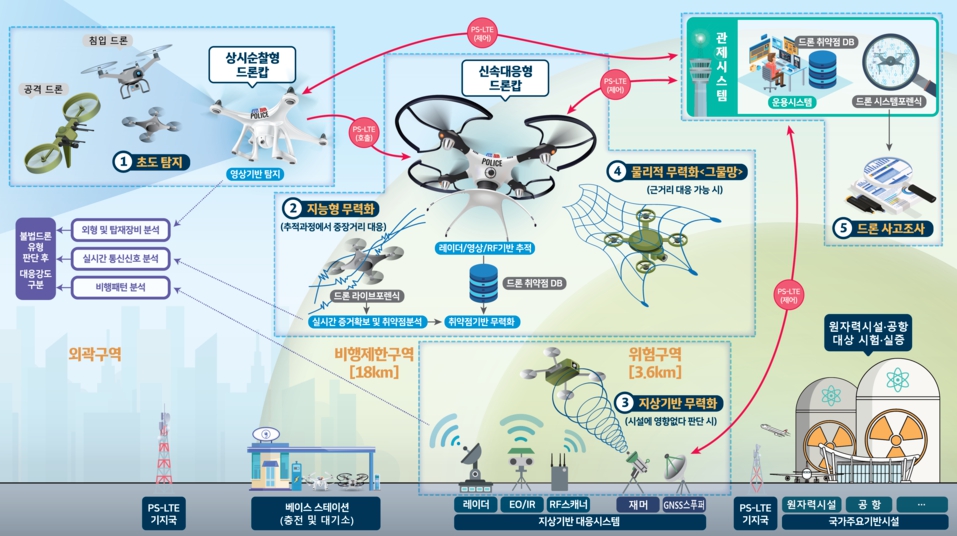 한국원자력연구원과 한국항공우주연구원 등이 참여하는 '불법 드론 지능형 대응기술 개발사업'은 항공 보안을 위협할 수 있는 불법 드론의 탐지·식별·추적·무력화에 주력하는 기술로 지상에서는 불법 드론을 탐지해 무력화시키고, 공중에서는 상시 순찰하며 불법 드론을 직접 무력화하는 기술로 구성된다. 안티 드론 시스템이라 명명된 이 기술은 개발이 완료되면 원자력 시설과 공항을 비롯해 국가 중요 시설에 우선 구축될 예정이다.