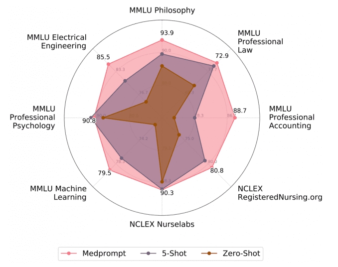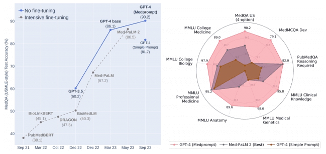 이어 최근 연구에서 여러 프롬프트 전략을 '메트프롬프트(Medprompt)'란 방법으로 구성해 GPT-4가 최고 성능을 달성할 수 있도록 효율적으로 유도하는 방법을 보여줬다. 메드프롬프트를 적용한 GPT-4는 최고의 성능을 발휘하는 것으로 나타났다.
