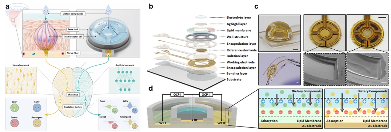 DGIST(총장 이건우) 로봇및기계전자공학과 장경인 교수 연구팀과 KAIST(총장 이광형) 항공우주공학과 최지환 교수 연구팀이 인간 미각을 모방한 인공 전자혀 시스템을 개발했다.