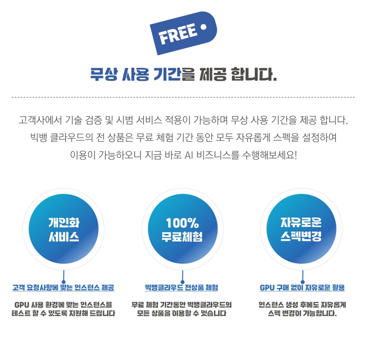 고객사에서는 기술 검증 및 시범 서비스 적용이 가능하며 무상 사용 기간을 제공하고 있습니다. 빅뱅클라우드 서비스는 무료 체험 기간(무료 사용 포인트 지급) 내 자유롭게 스펙을 설정하여 이용이 가능하오니 지금 바로 AI 비즈니스를 수행해보세요!