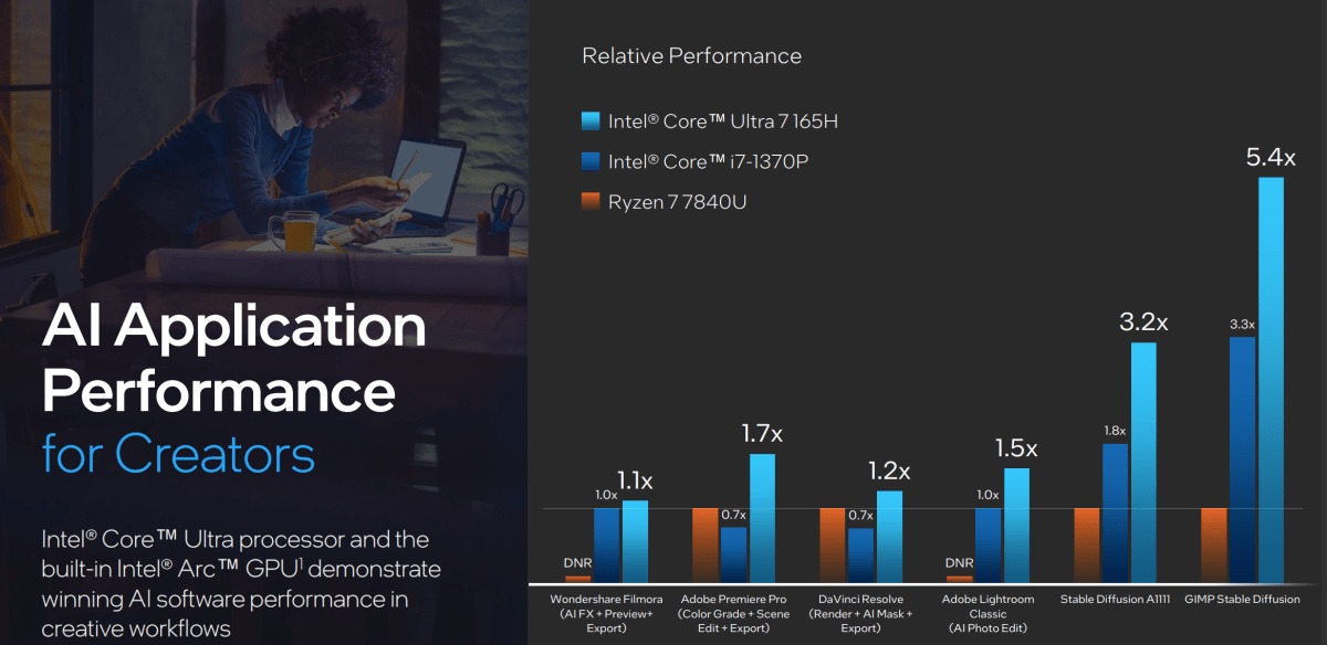 또한 인텔은 NPU를 활용해 성능을 향상시키고(코어 i7-1370P와 비교해 스테이블 디퓨전에서 1.7배 성능 향상), 전력을 절약할 수 있다고 말했다(줌 화상통화에서 전력 소비 38% 감소). 아울러 AI 기능을 갖춘 프리미어 프로, 필모라(Filmora) 등 다양한 앱에서의 일부 성능 데이터도 제시했다.